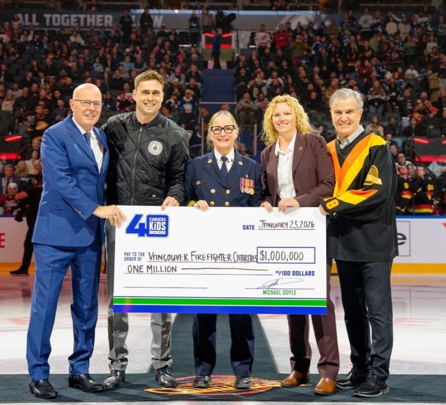 Le Fonds Canucks For Kids (CFKF) a remis un chèque d’un million de dollars aux organismes de bienfaisance des pompiers de Vancouver (VFC) lors de la Nuit des pompiers canadiens de Vancouver le 23 janvier.