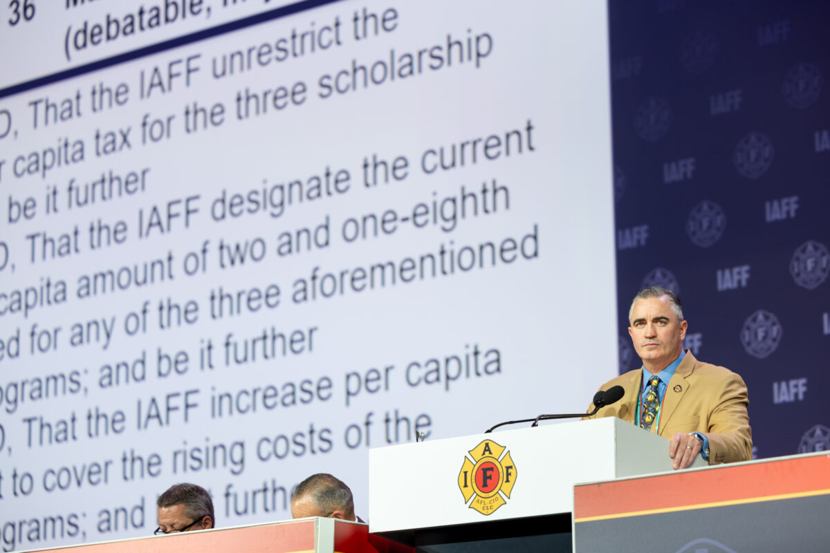 Resolution 36: Proposes expanding and securing funding for IAFF scholarships by increasing the per capita by 1 cent and allowing flexibility in fund usage across the three supported scholarship programs.