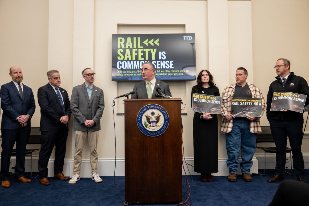 The remarks came at a press conference marking the third anniversary of the Norfolk Southern derailment in East Palestine, Ohio. Speakers included bill co-leads Reps. Chris Deluzio, D-Pa.; John Garamendi, D-Calif.; and Mike Rulli, R-Ohio, along with co-sponsor Rep. Mike Lawler, R-N.Y.; House Rail Subcommittee Ranking Member Rep. Dina Titus, D-Nev.; Pittston Mayor Michael Lombardo; Altoona Mayor Matt Pacifico; and labor leaders, including Brotherhood of Railroad Signalmen President Mike Baldwin and Transportation Trades Department, AFL-CIO President Greg Regan.